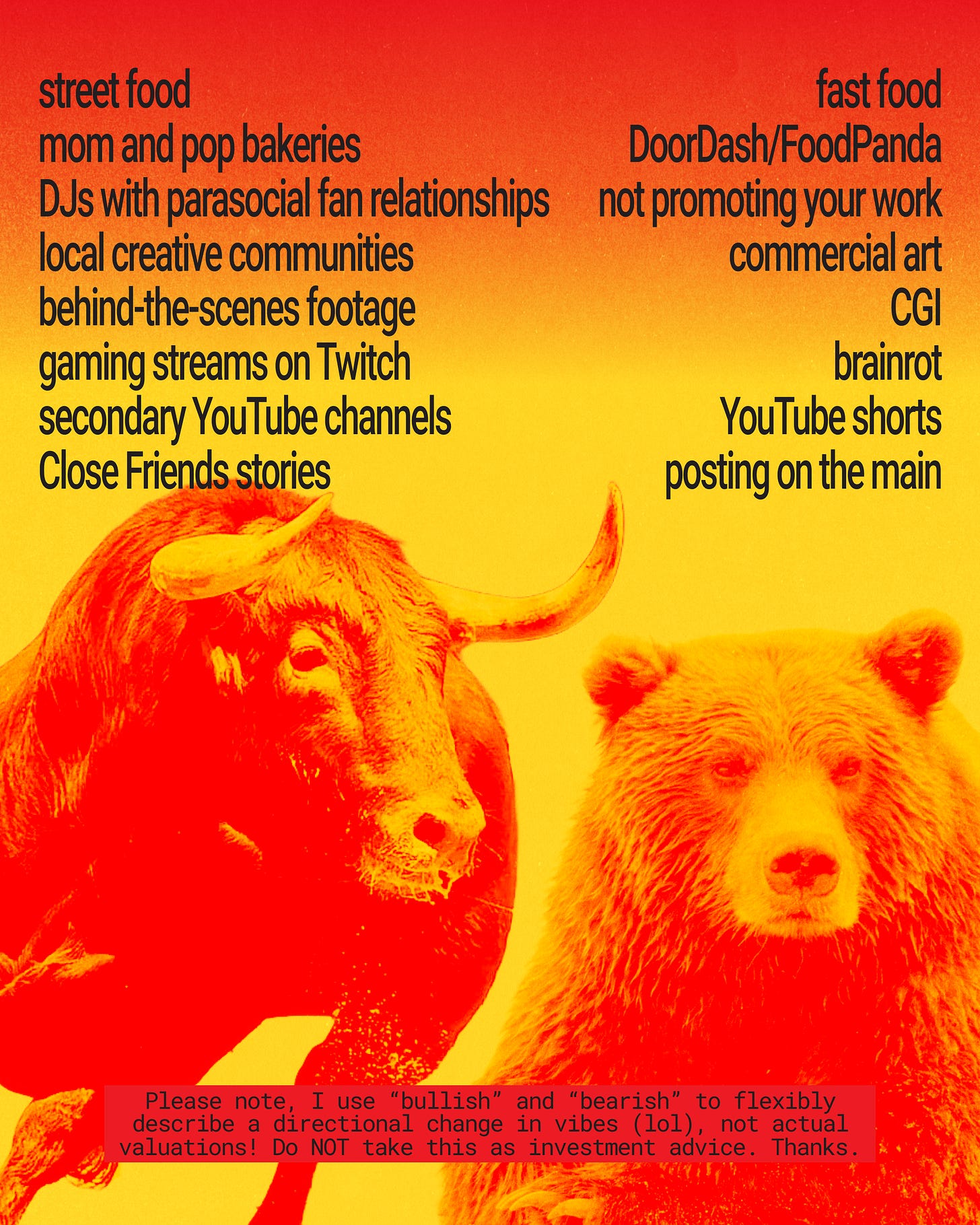 And recently, Resident Advisor argued in their RA PRO newsletter that since the COVID-19 pandemic, more electronic music producers are using social media platforms to share works-in-progress, asking fans for feedback, in part to prove that their work is human-made. Another example I’m a fan of was the viral Zoom meeting between A24’s brand marketing team and Timothee Chalamet. On YouTube, the video resonated because it was funny, but I also like to think that it gave a personalized, insider view into the eccentricities that come with making a film like Marty Supreme.