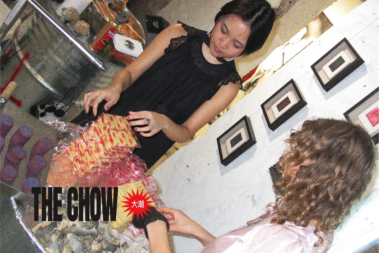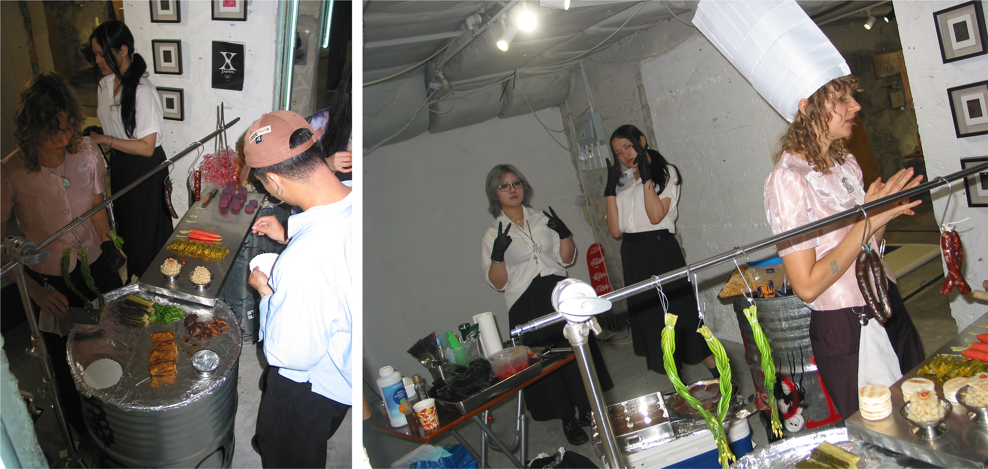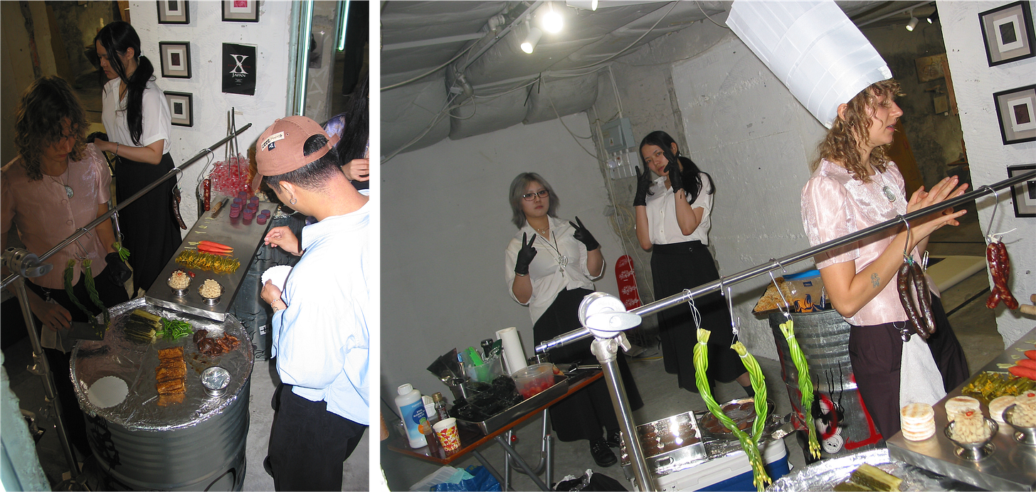 The main dish of the evening was a tofu-laced mac and cheese bite, a more nutritious version of Kraft Mac and Cheese meals which, Louie and Renee say, are frequent in the life of a broke artist. The rest of the menu was similarly built around artist “struggle meals,” or, as the event announcement post says, “the kind of food you eat when rent’s due and all you’ve got is discounted shit you get from the wet market.” Affordable Chinese delicacies like fish skin and pickles were stacked onto a foil charcuterie board. Other menu highlights included a squid ink chicken liver pate topped with lychee jelly, and a tomato-egg rice onigiri.