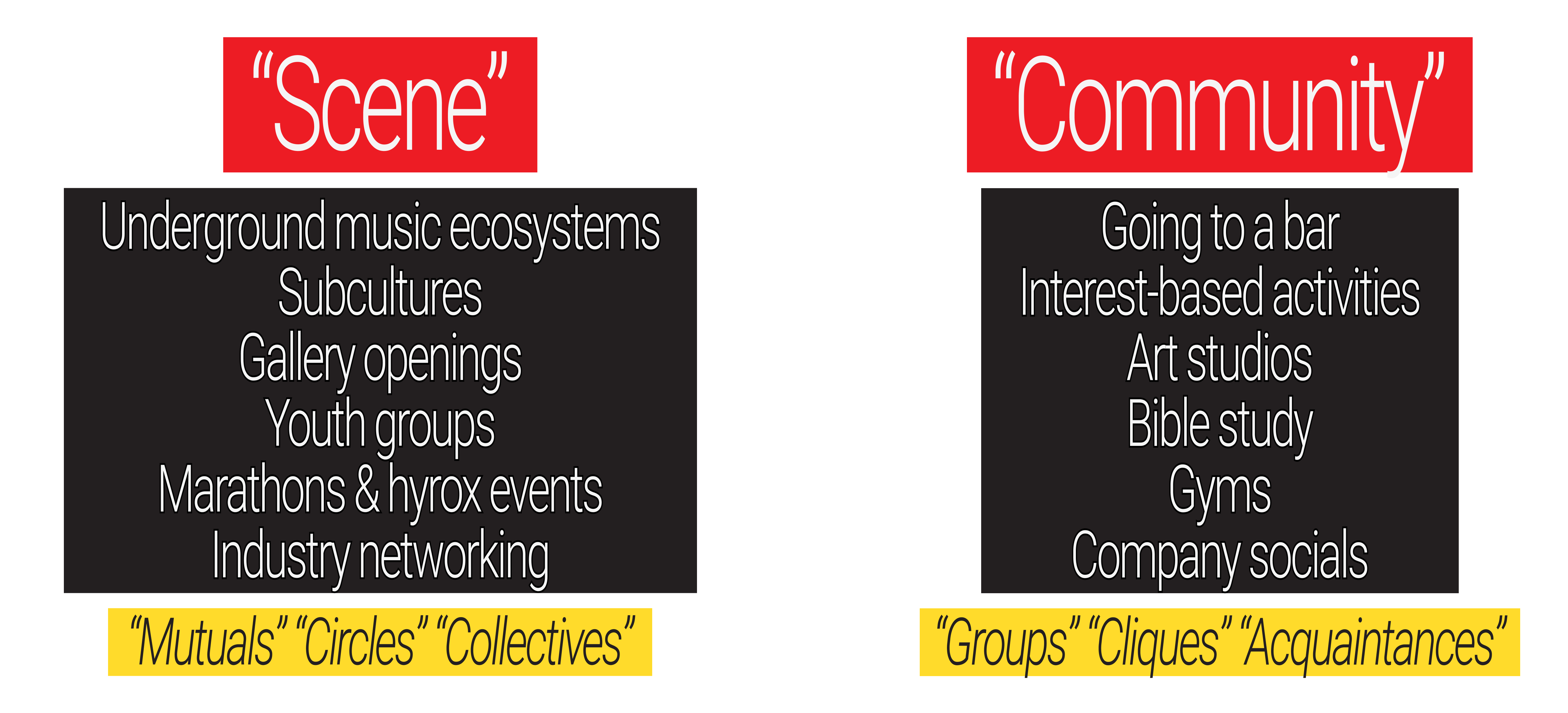 Communities tend to imply fixed-ness—a fixed meeting time, fixed location, fixed group of people, fixed interests. Scenes are not so constrained: there are many people, many interests, many events happening at once, but all have a similar experience or principle (e.g. a creative scene is anchored around being creative).