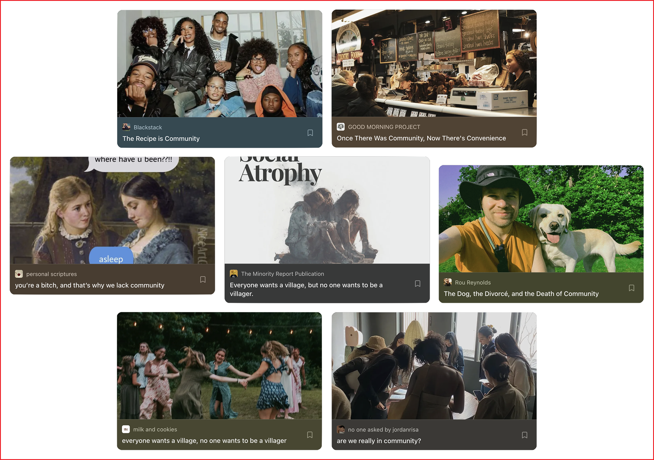 But today the word reads like a meaningless catch-all. “Community” is a nothing—it can mean anything from gyms to churches to discord servers, but also all the houses and stores on the same street, your political ideology, or people who all buy the same brand of clothing. And there’s often a more sinister assumption that lies behind the desire to just Get People Together and Call It a Day: that a happy, fun, unproblematic, uncomplicated group of friends with similar personalities to your own will eventually arrive to you on a silver platter.