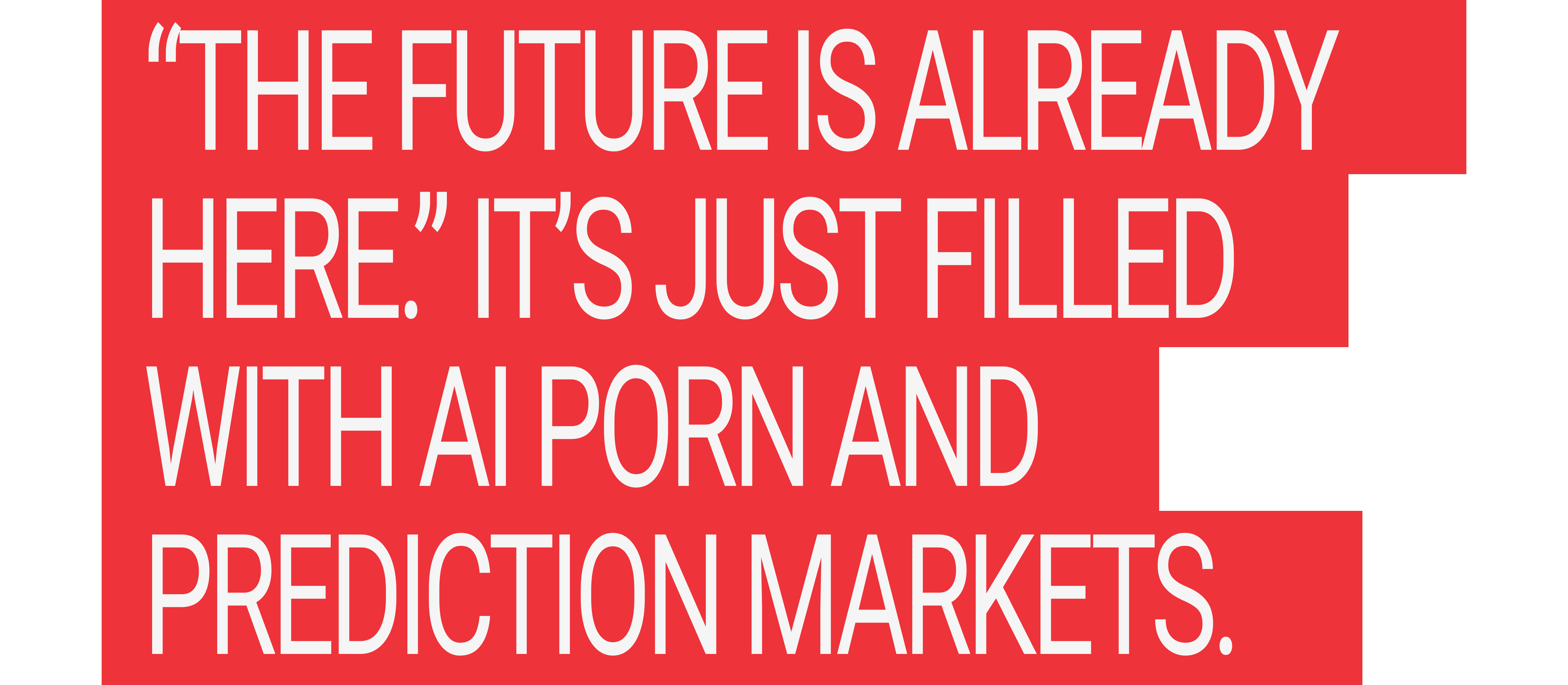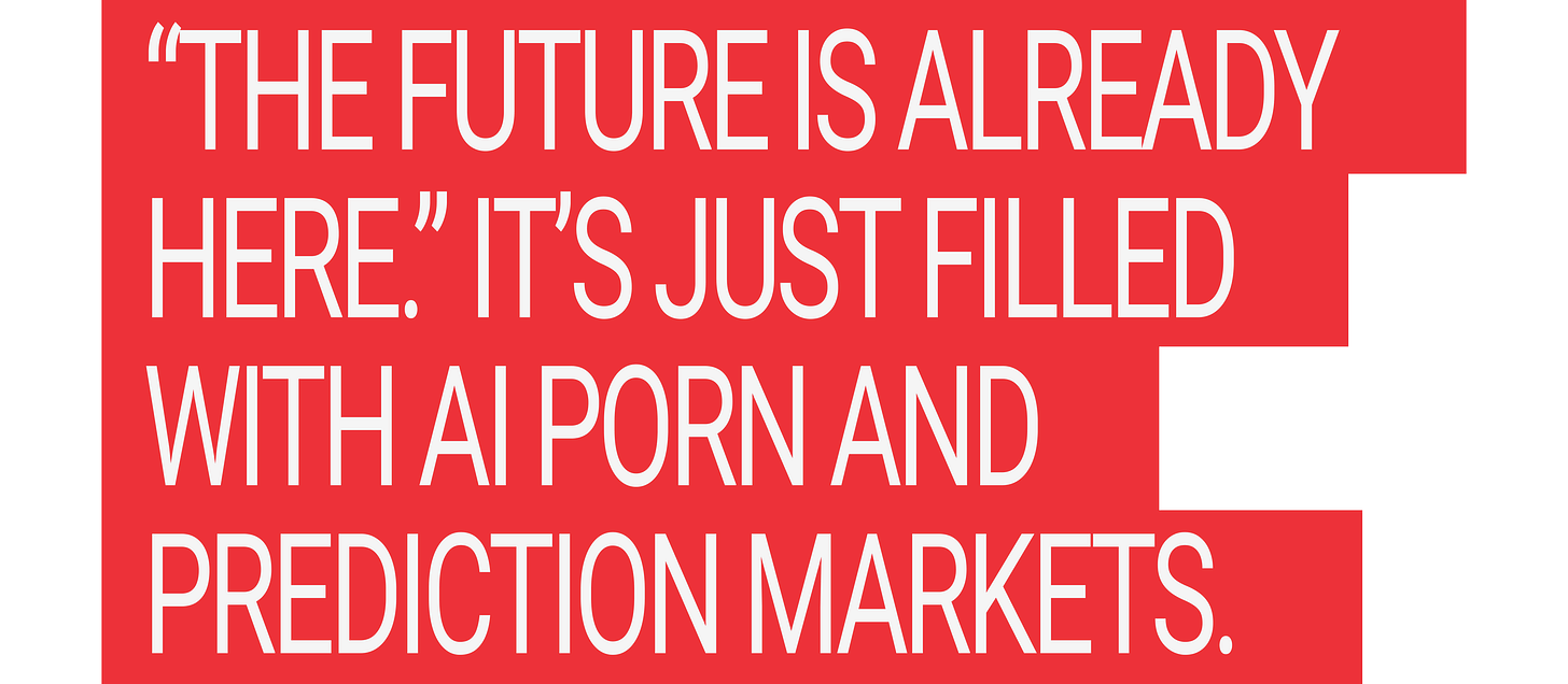 Punks and hackers haven’t kept their staying power through the 2020s, and their rebellious ethos has failed to keep pace with the $1.4 trillion or $423 billion market caps of Tesla or Palantir. Cyberpunk promised us that rampant inequality and a capitalism without limits would turn us into cool netrunners, underground biohackers, or marksmen clad in neon armor. But now in a world with an accelerating divide between the rich and the poor, we have gooners, men with gambling addictions, and urbanites on ozempic. “The future is already here,” as William Gibson once wrote—it’s just filled with AI porn and prediction markets.