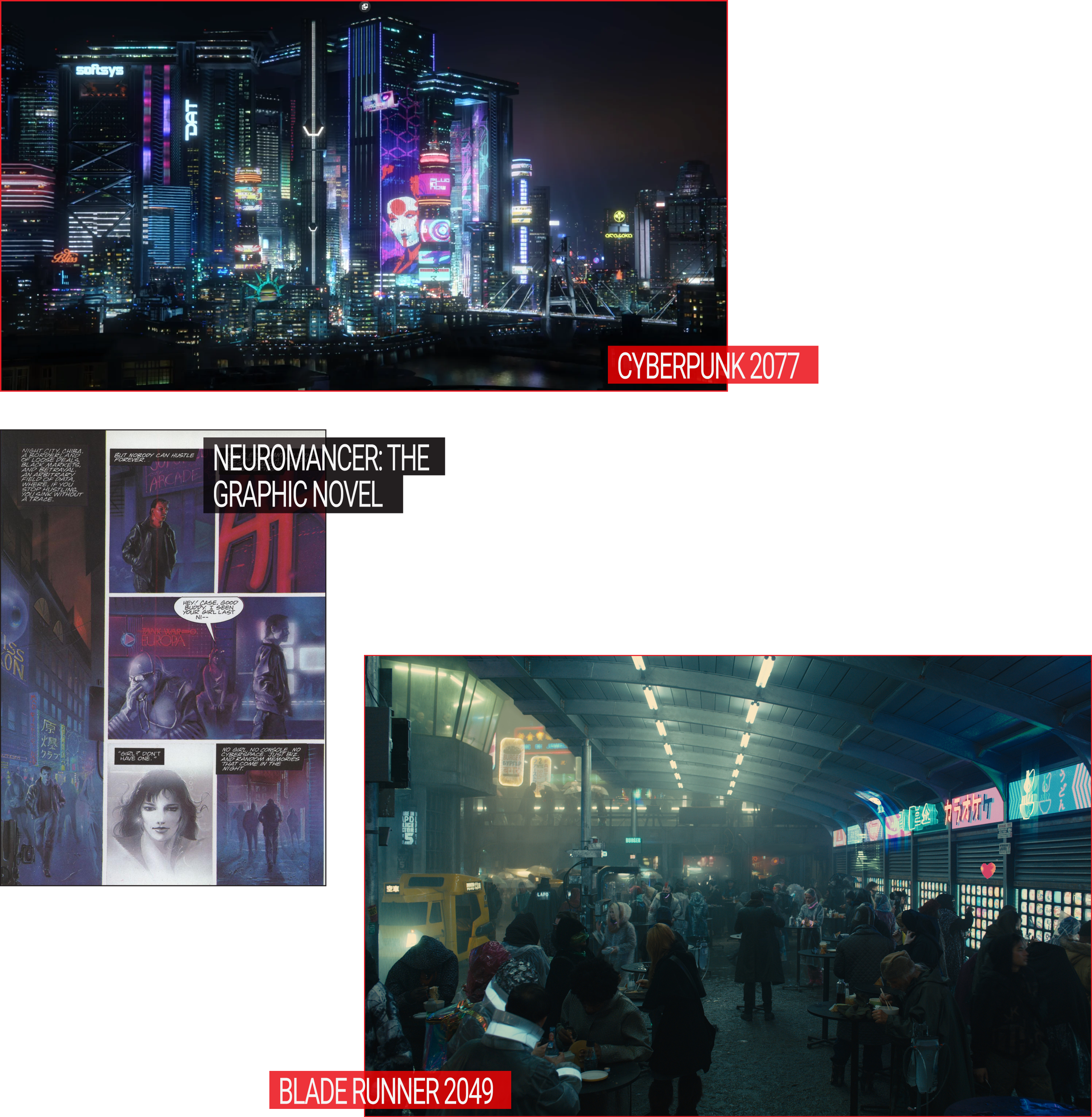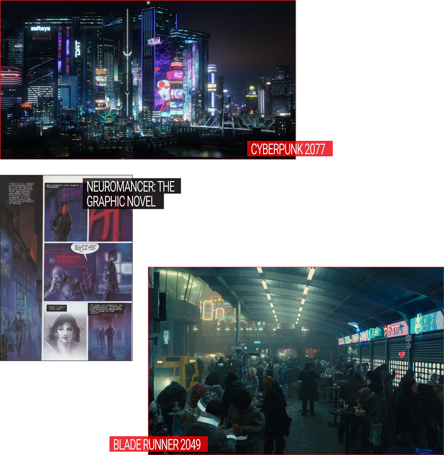 The opening line of Neuromancer, William Gibson’s seminal cyberpunk novel, describes the skyline of Chiba, Japan: “The sky above the port was the color of television, tuned to a dead channel.” You might imagine fifty-or-so years from now to have flying cars, rogue AIs in humanlike flesh, body alterations merging muscle with machine, or an internet that functions like ‘cyberspace’—but when imagining “the future,” Gibson knew to direct his attention to the streets and skylines. After all, the city is frequently the first site of exploration for what the future will look like, and often, that vision has looked something like this: